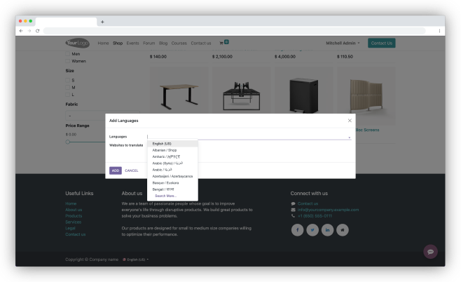 Odoo automatically provides translations for each page, allowing you to tap into international customer potential without additional effort.